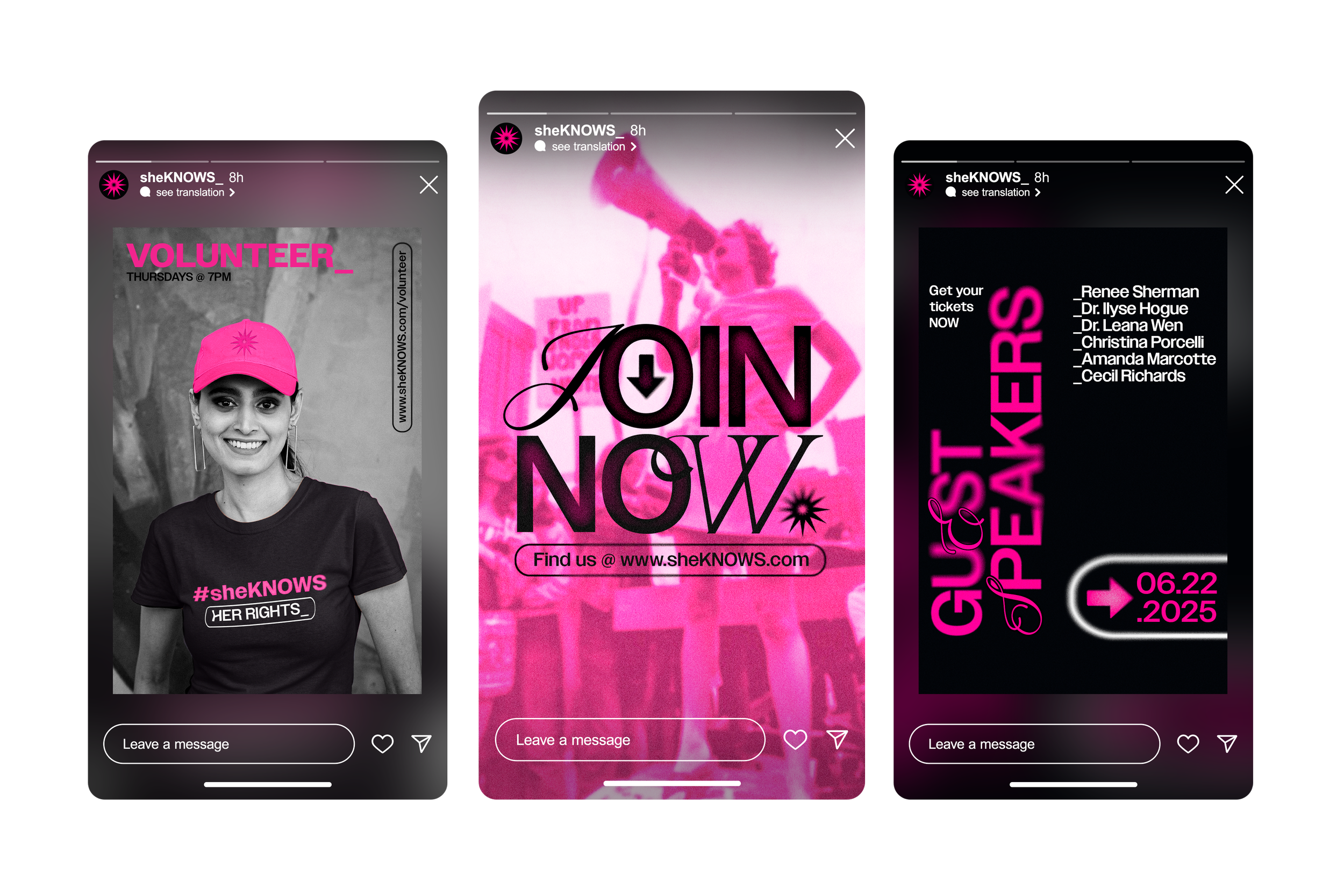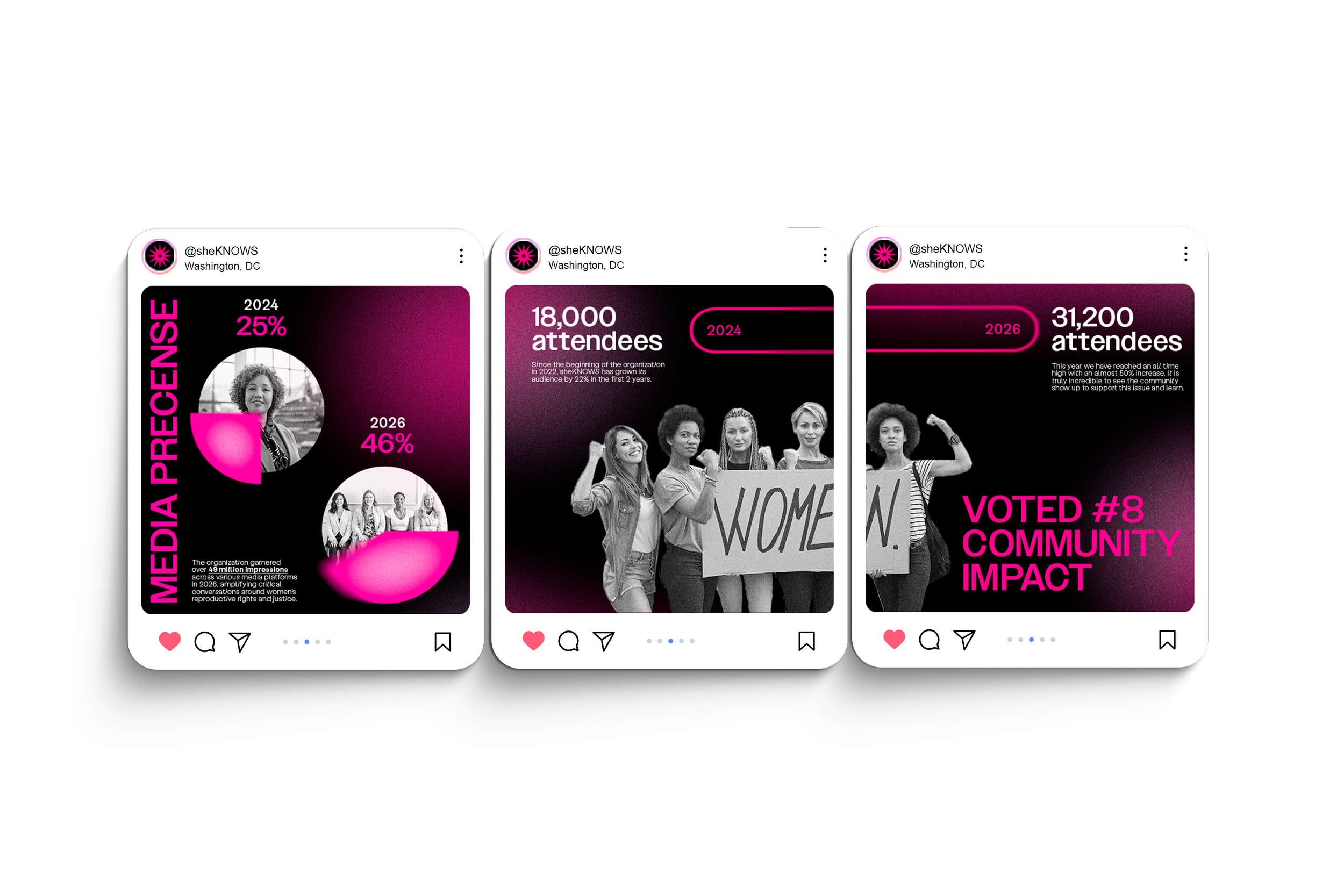 For the sheKNOWS Conference 2026, designed to unite experts, advocates, politicians, and activists around the issue of women's reproductive rights, I developed impactful branding and design assets. Given the resource constraints of many non-profit organizations, creating clear and compelling visuals was an act of rebellion in itself. By ensuring the campaign's messaging was not only visually striking but also effective in communicating urgent, powerful conversations, I helped amplify voices in the fight for reproductive justice and support the broader mission of change.